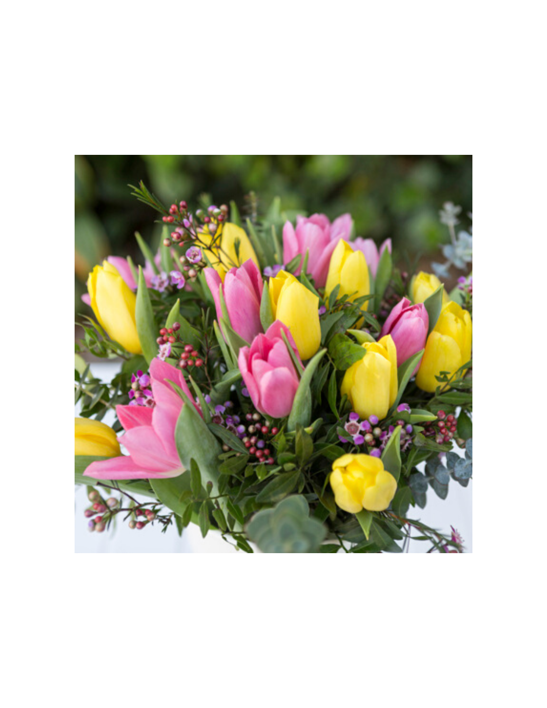 Coloratissimo bouquet di tulipani, wax flower e populus.