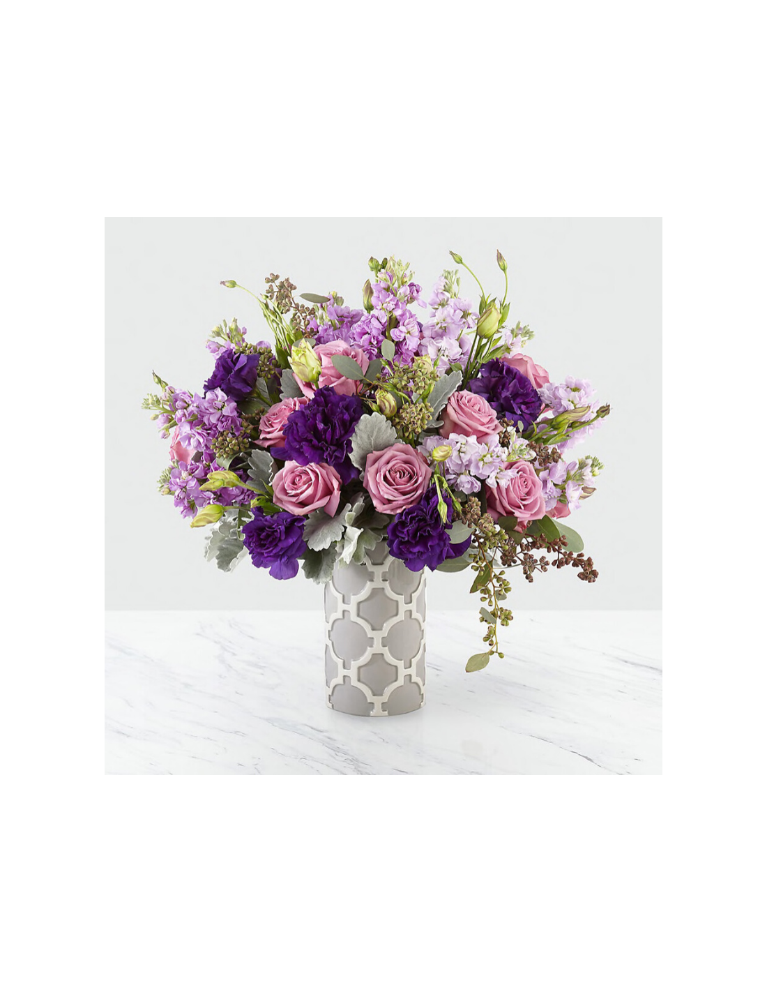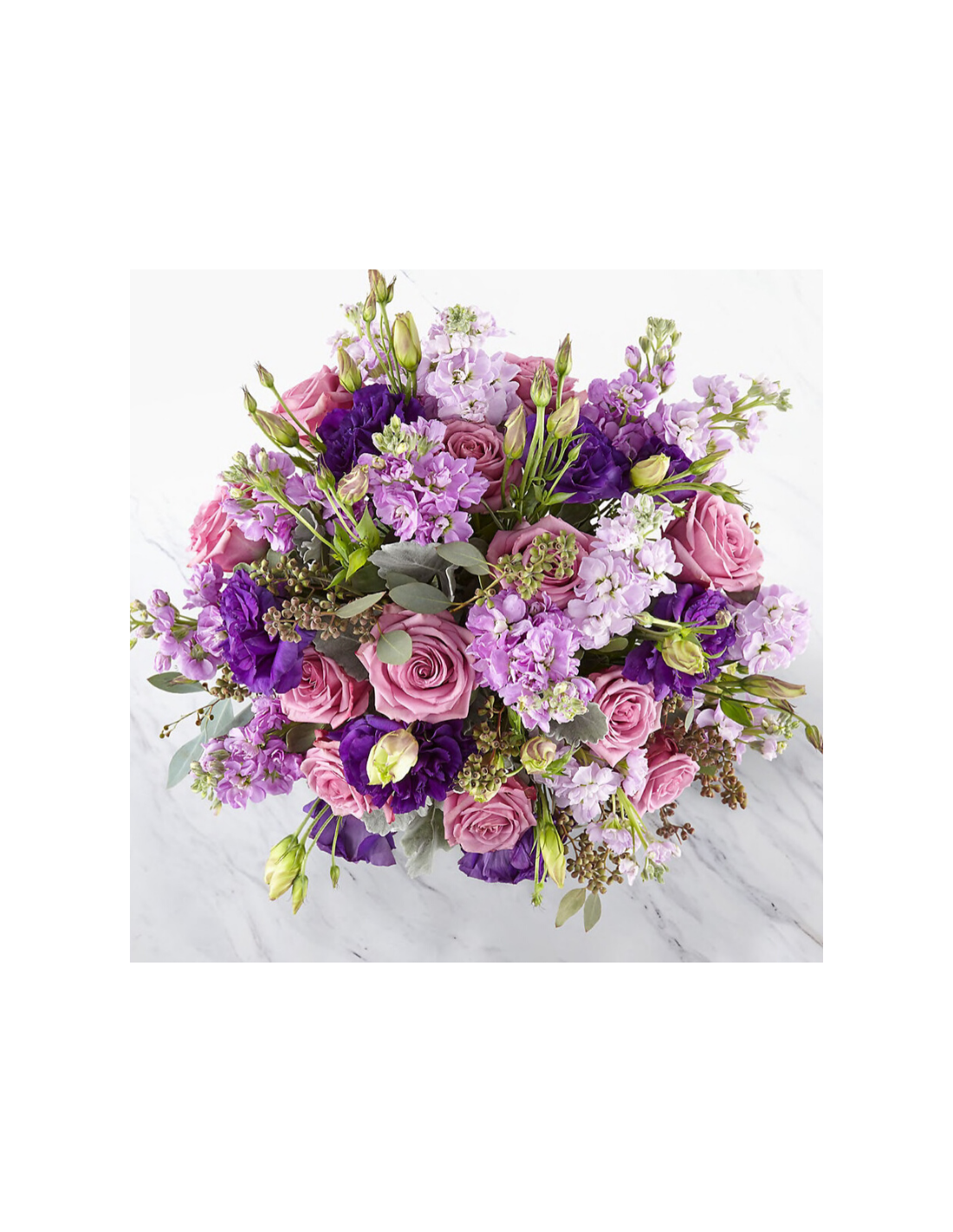 Bouquet di rose, violaciocche e lisianthus