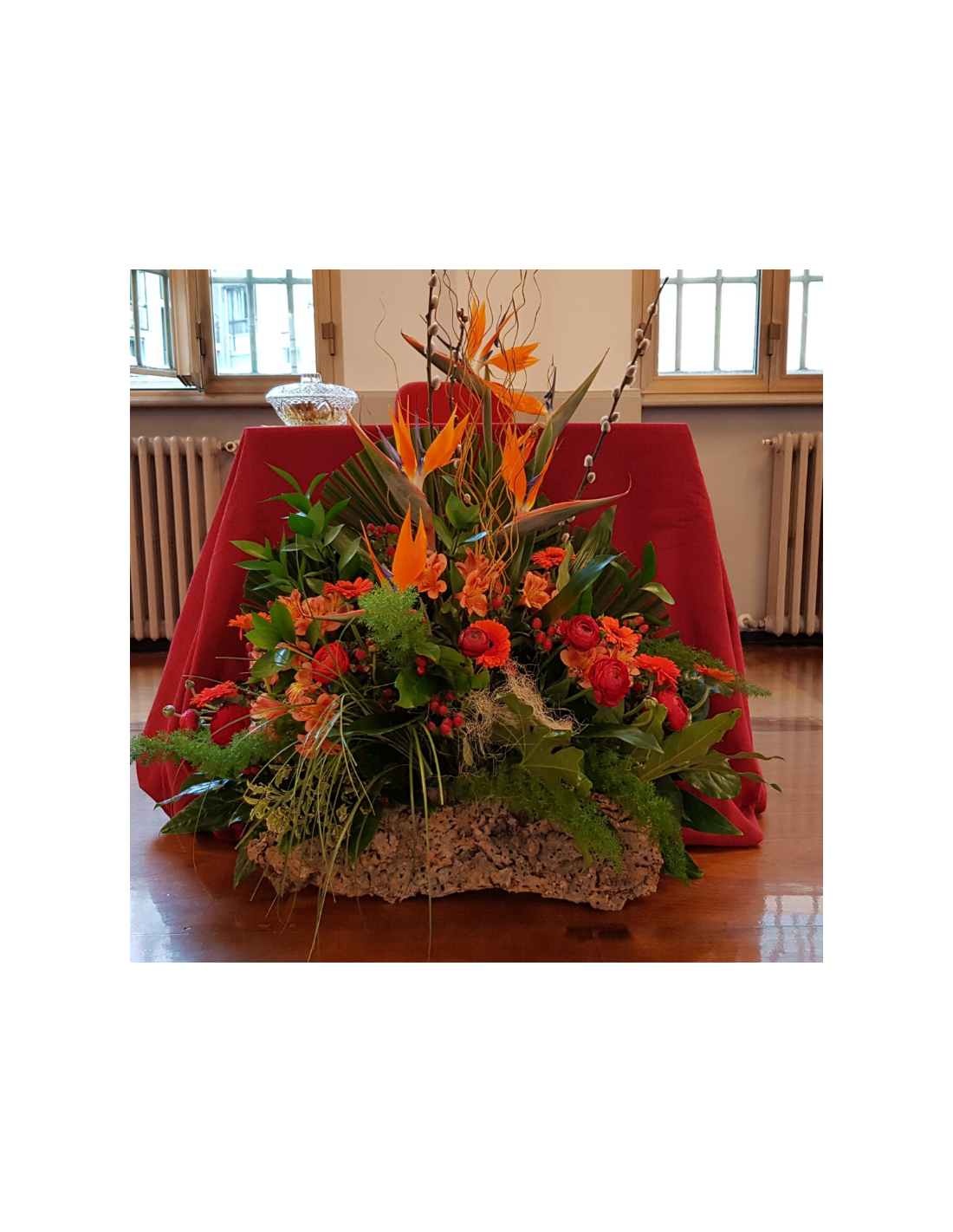 Composizione su tronco di strelitzie e bacche