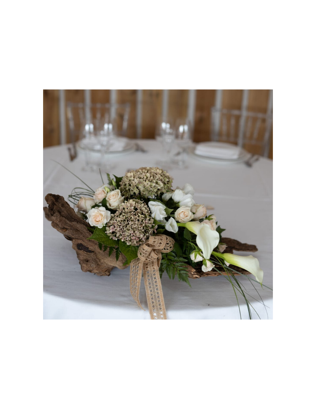Composizione floreale su tronco vero con roselline, lisianthus, ortensie e calle.