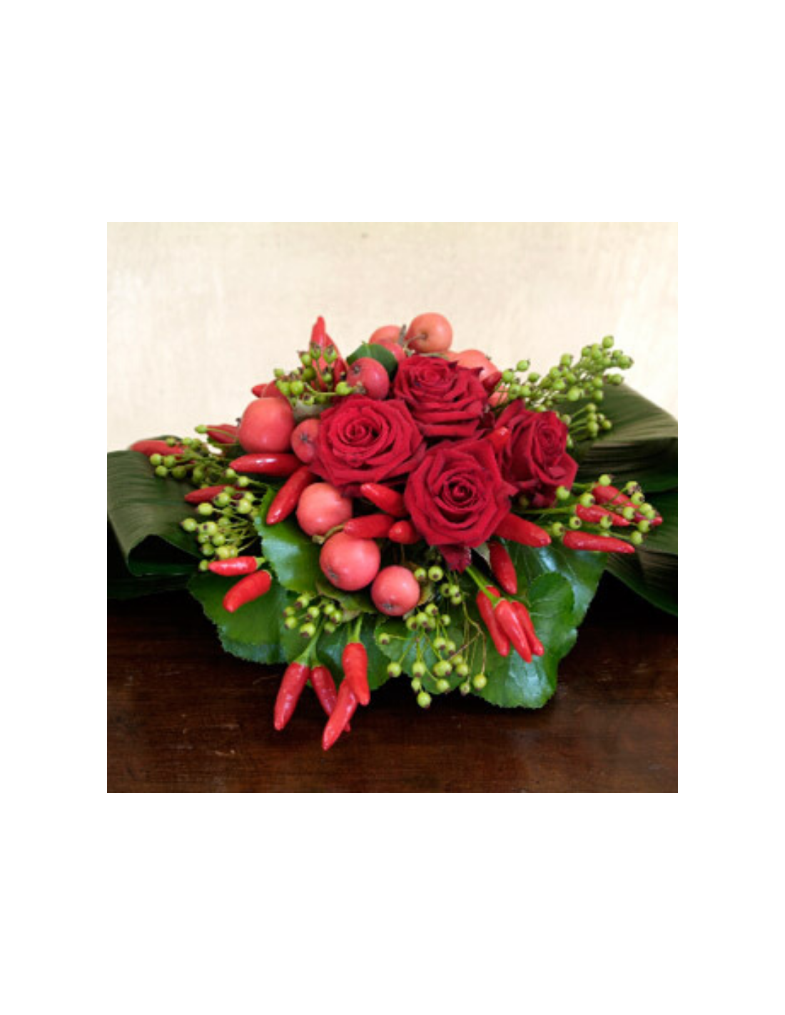 Meraviglioso centrotavola con rose rosse, peperoncini e foglie di aspidistra, perfetto per il periodo natalizio.