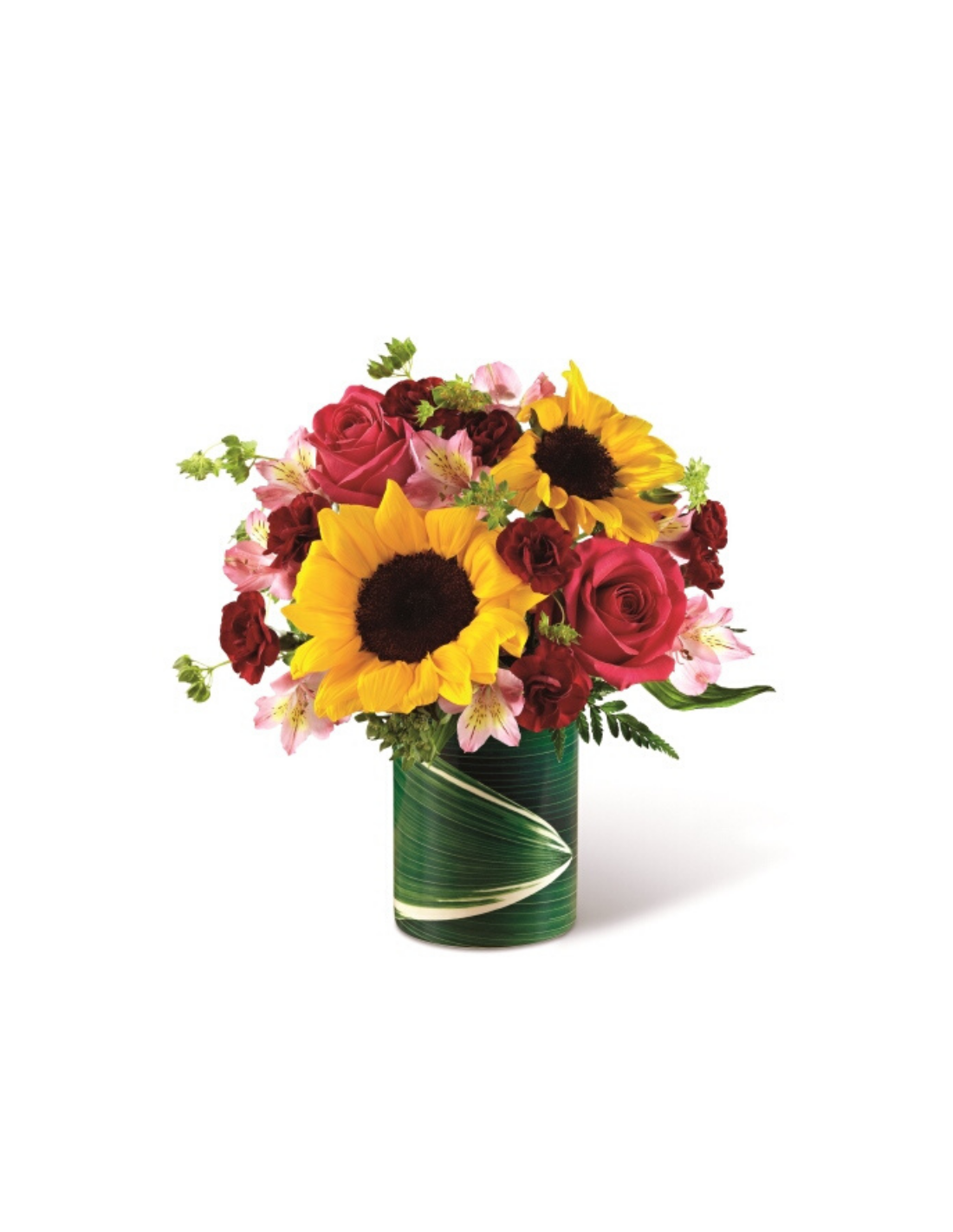 Estiva composizione floreale su spugna con rose, girasoli e alstromeria sui toni caldi.