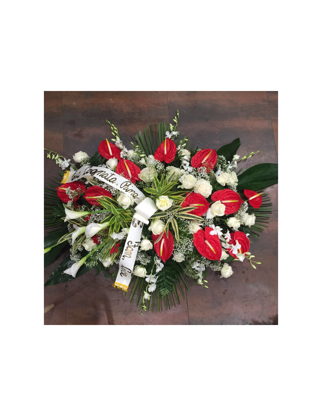 Cuscino funebre di calle, anthurium, rose bianche e orchidee