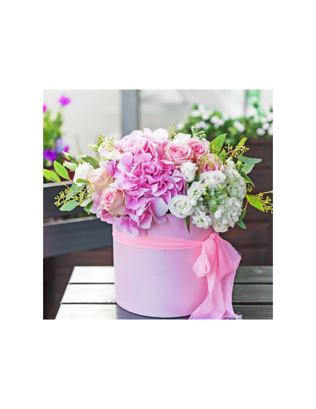 Una flowerbox sui toni rosati con ortensie, rose e roselline.