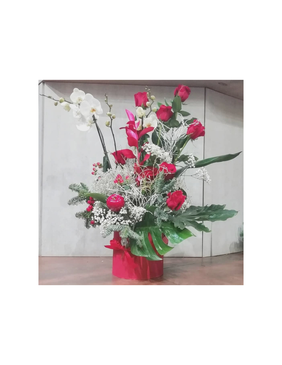 Composizione simile a flowerbox con rose rosse, rami bianchi, pino e pianta di phalenos che crea una perfetta atmosfera natalizia nelle fredde giornate invernali.