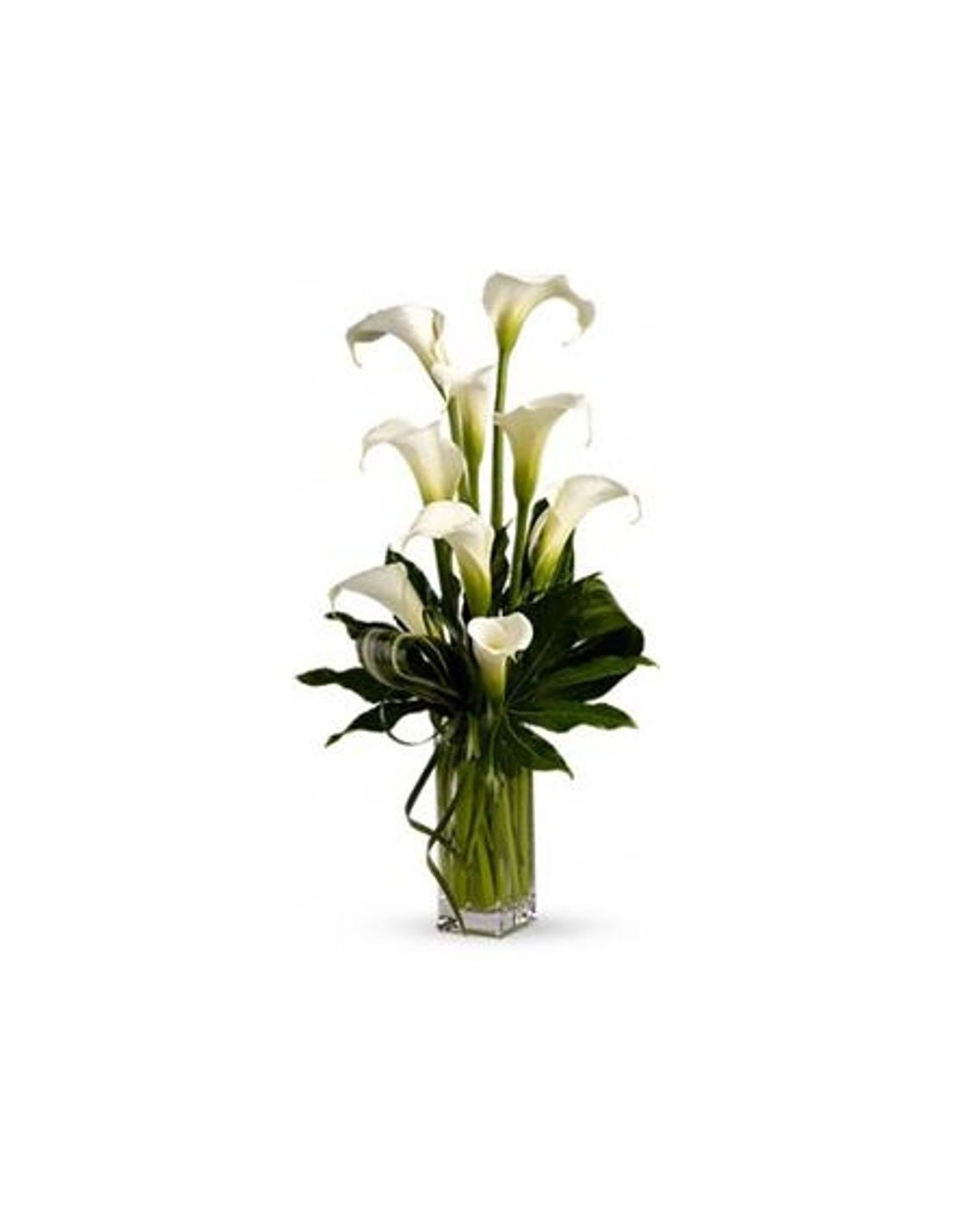 splendido bouquet di calle bianche e foglie di aspidistra verdi.Molto elegante sarà un omaggio molto apprezzato