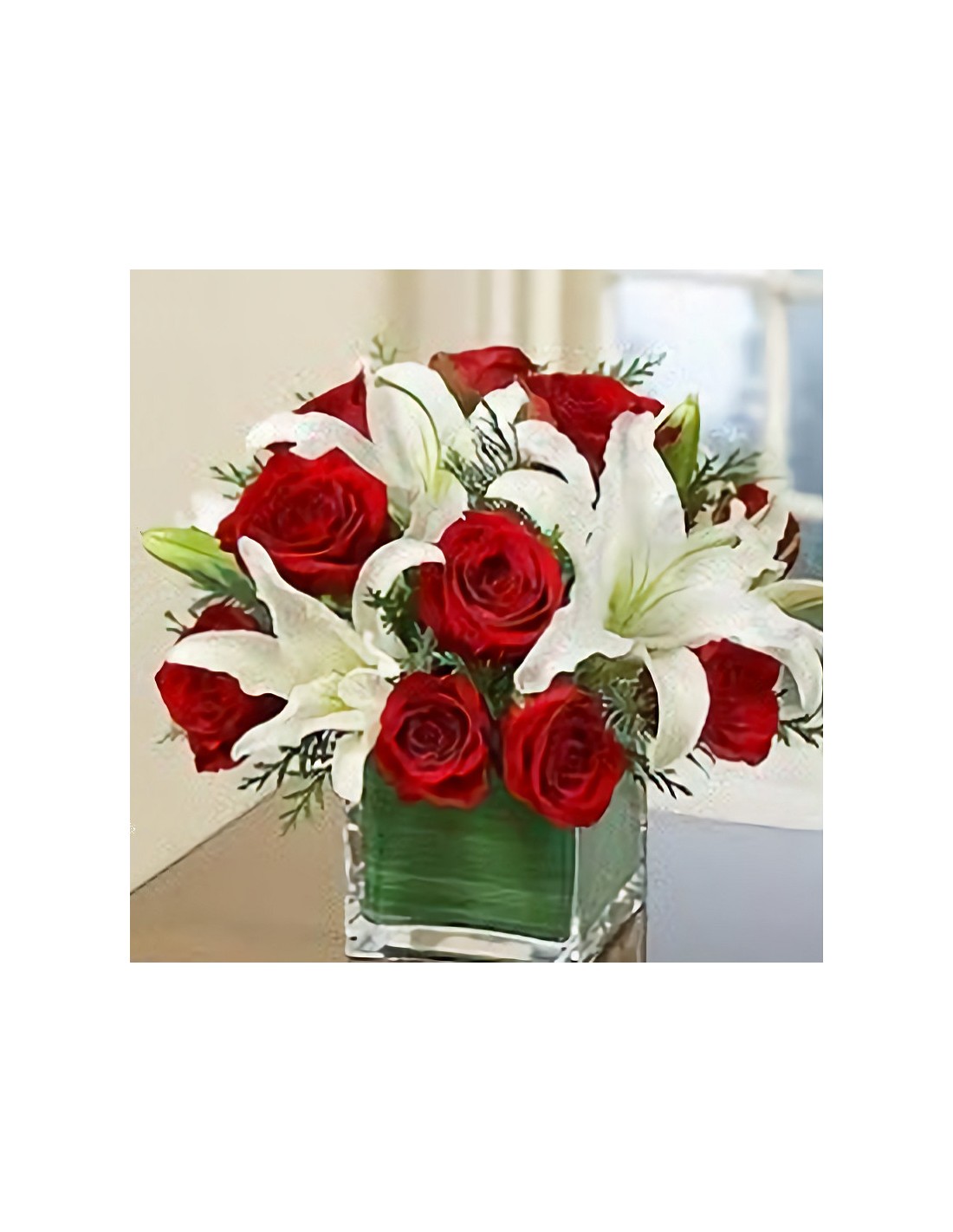 centrotavola in vaso di cristallo con rose rosse e liliim bianchi per non passare inosservati.