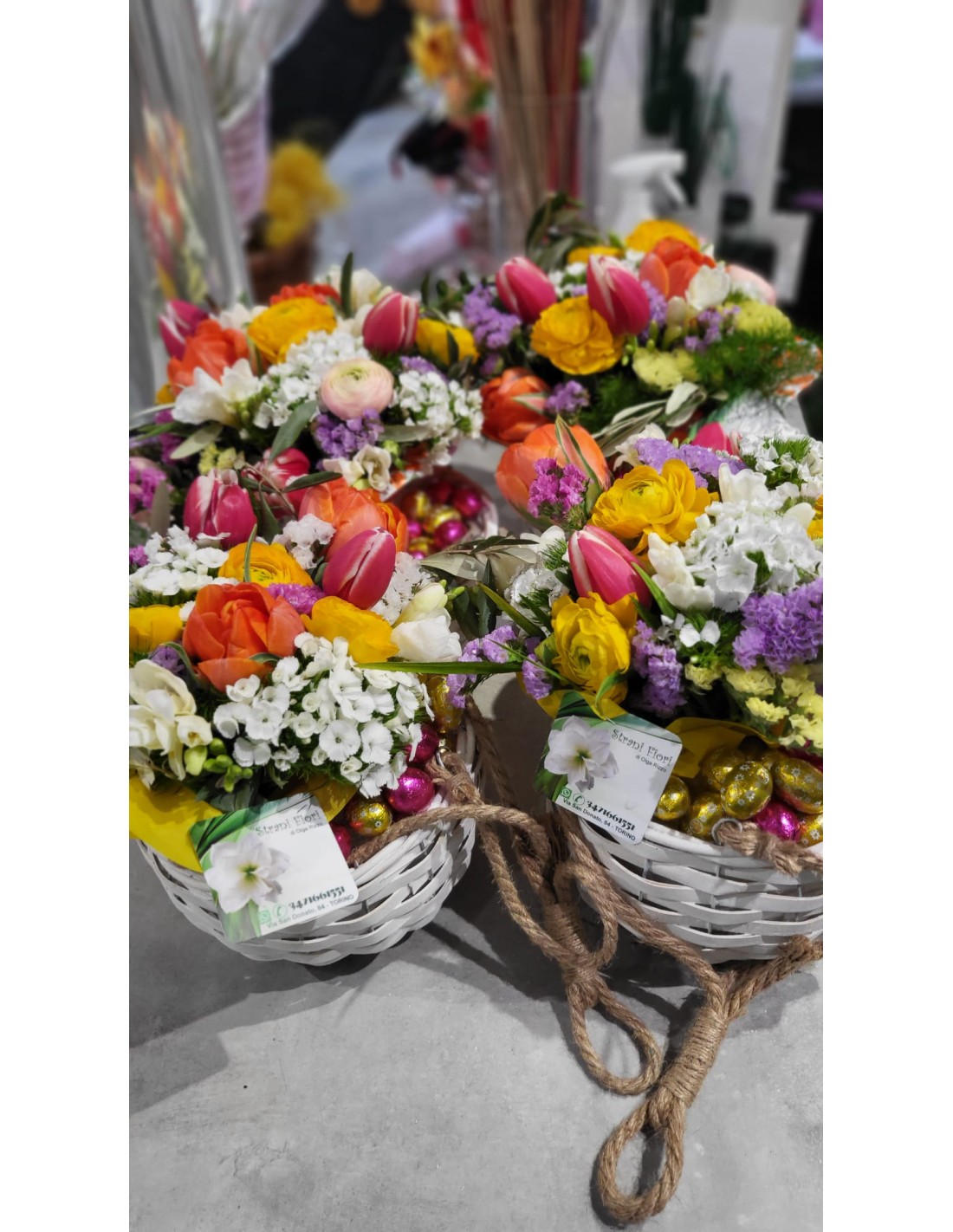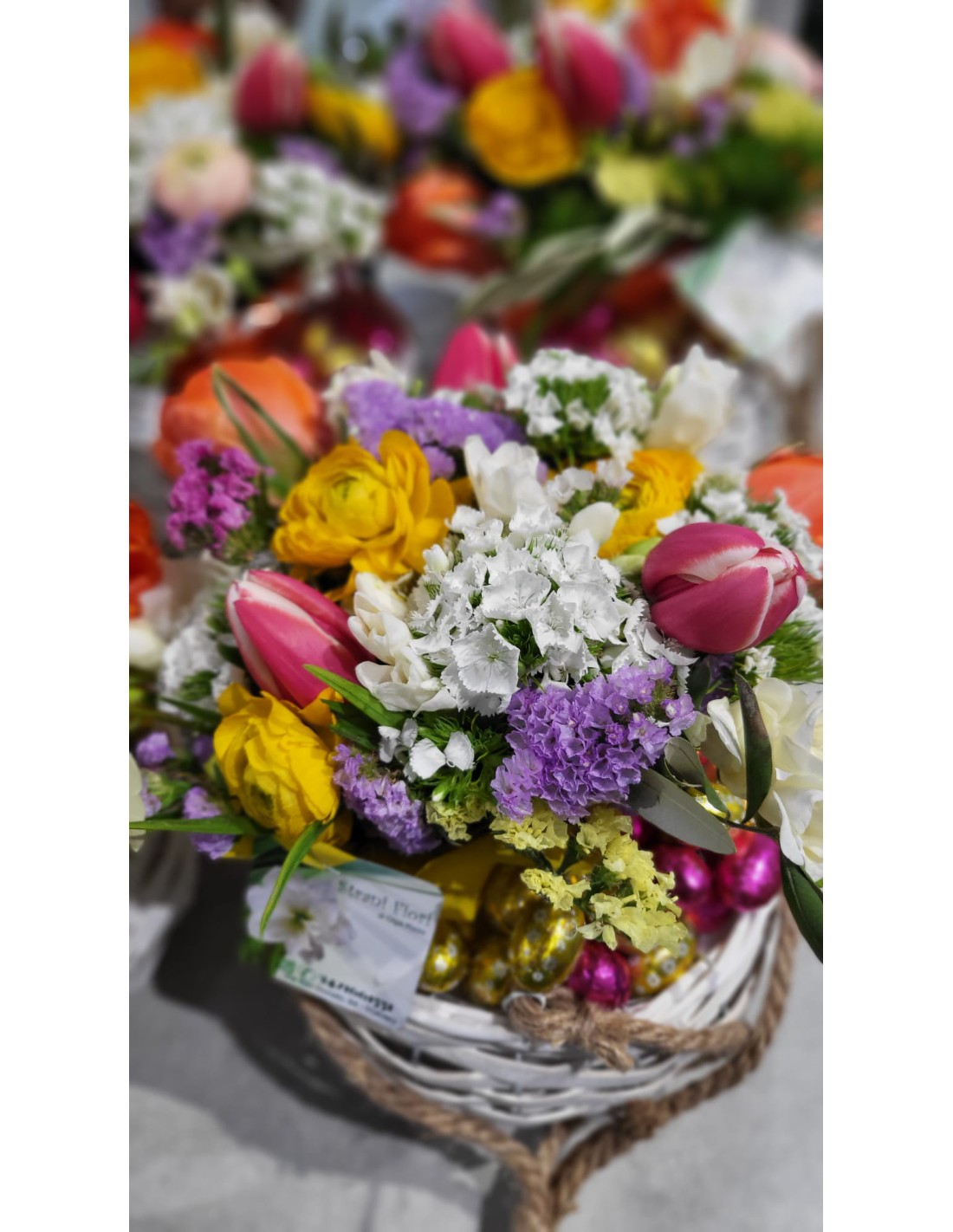 \ \ Cestino Pasquale con fiori e ovetti di cioccolato