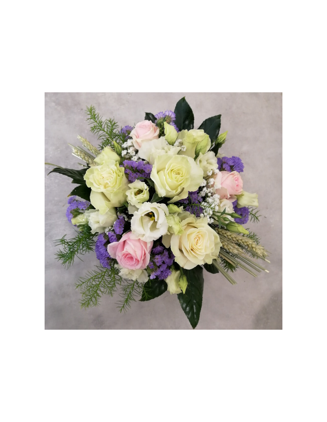 Composizione floreale in spugna con rose, lisianthus, statice e gipsophilla.