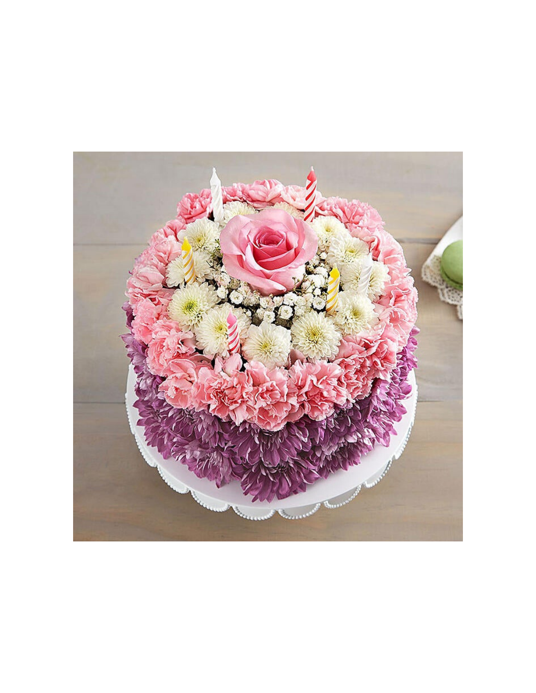 Fantastica torta di fiori per compleanno sui toni del rosa con San Carlini, Rose, Garofani e altri fiori di stagione.