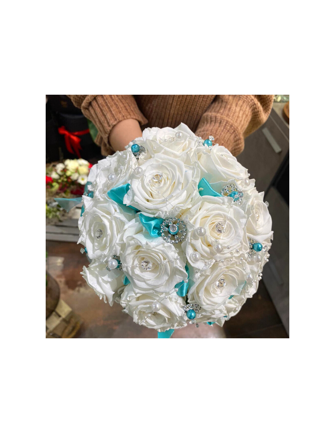 Meraviglioso bouquet sposa di rose stabilizzate nei colori tenui del bianco e azzurro: un bouquet che durerà per sempre, come il vostro amore!