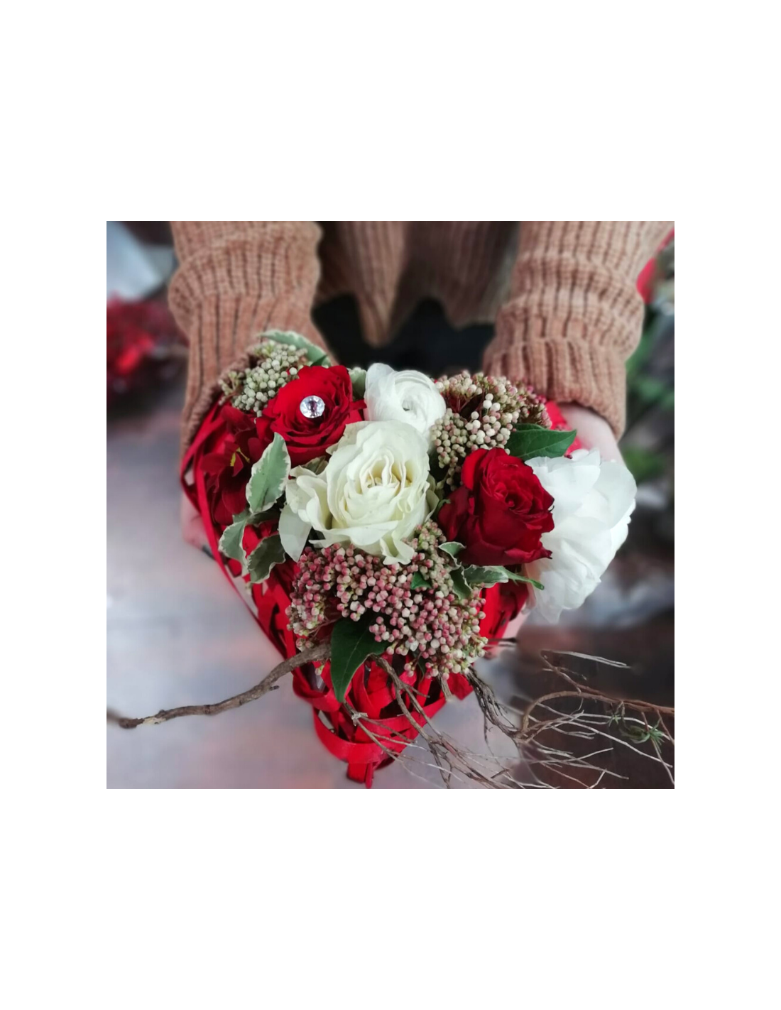 Meravigliosa e suggestiva composizione di rose rosse e bianche su spugna con cestino a forma di cuore.