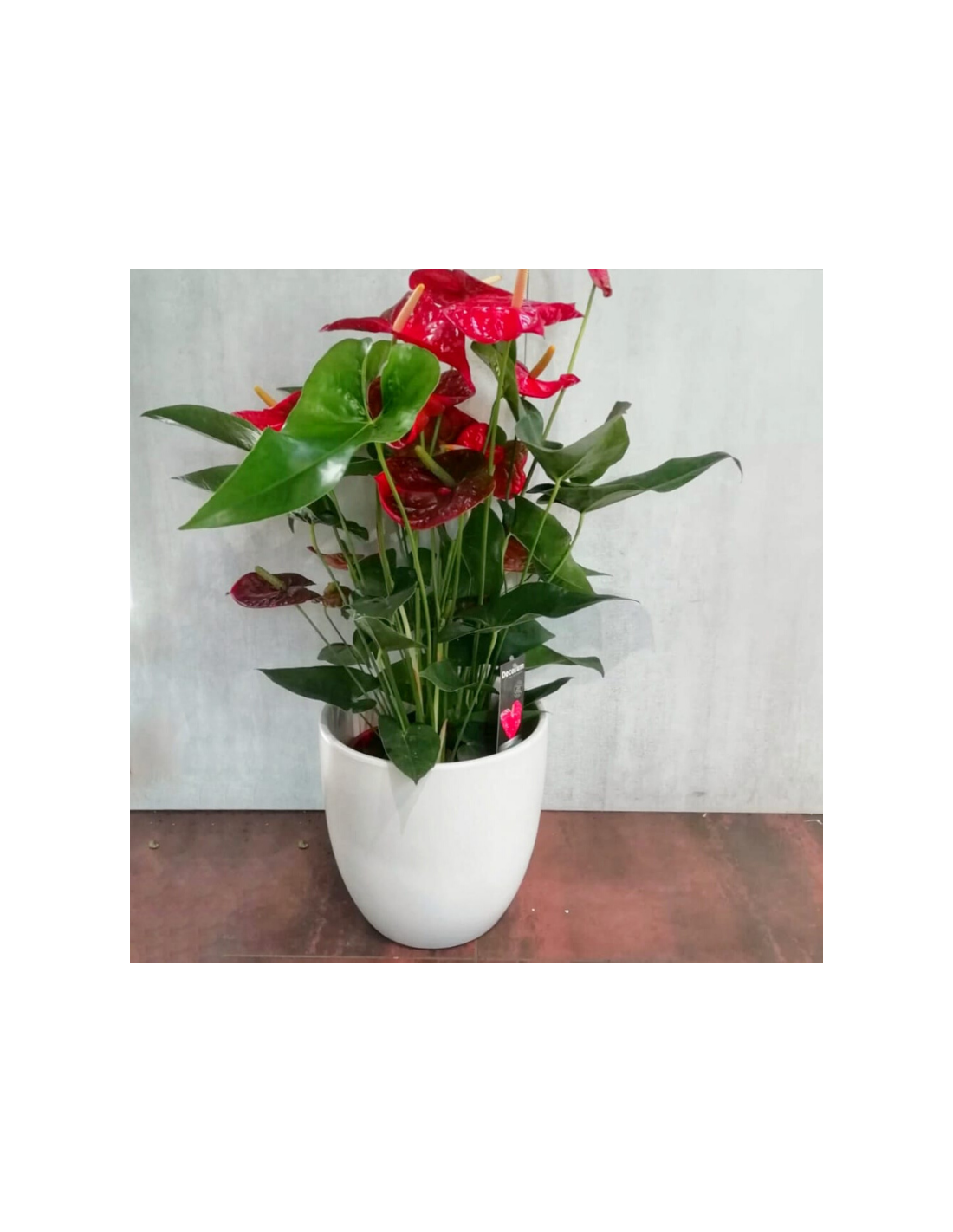 Pianta da interno di anthurium rossa che adorna splendidamente le stanze di una casa. Possibilità di aggiungere un cestino o una ceramica.