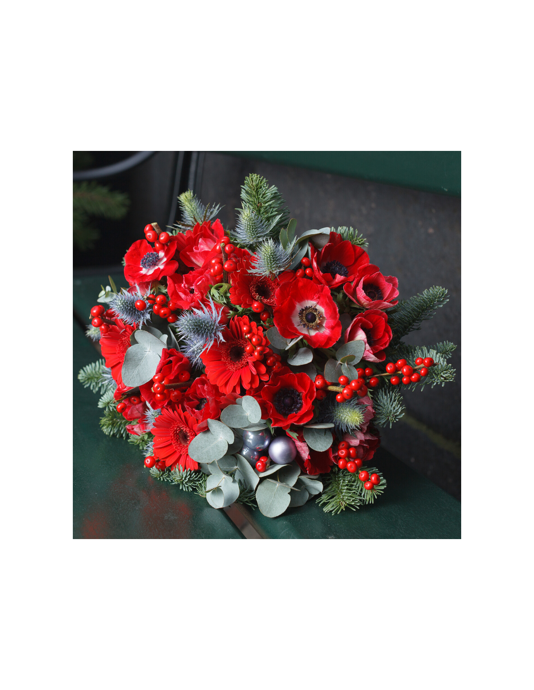 Incantevole bouquet natalizio con anemoni, bacche di ilex, pino nobilis, eringium e mini gerbere.