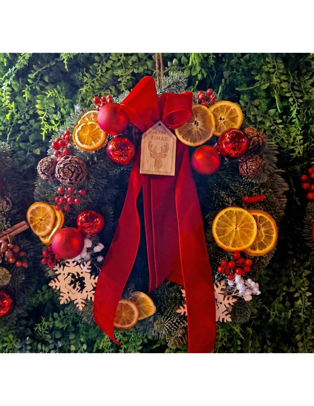 llumina la tua casa con la nostra Ghirlanda Natalizia Artigianale Premium, realizzata a mano con elementi naturali e decorazioni di qualità. Un mix elegante di pigne, bacche rosse, arance essiccate, palline rosse lucide e un fiocco in velluto rosso che dona un tocco raffinato e autenticamente natalizio.