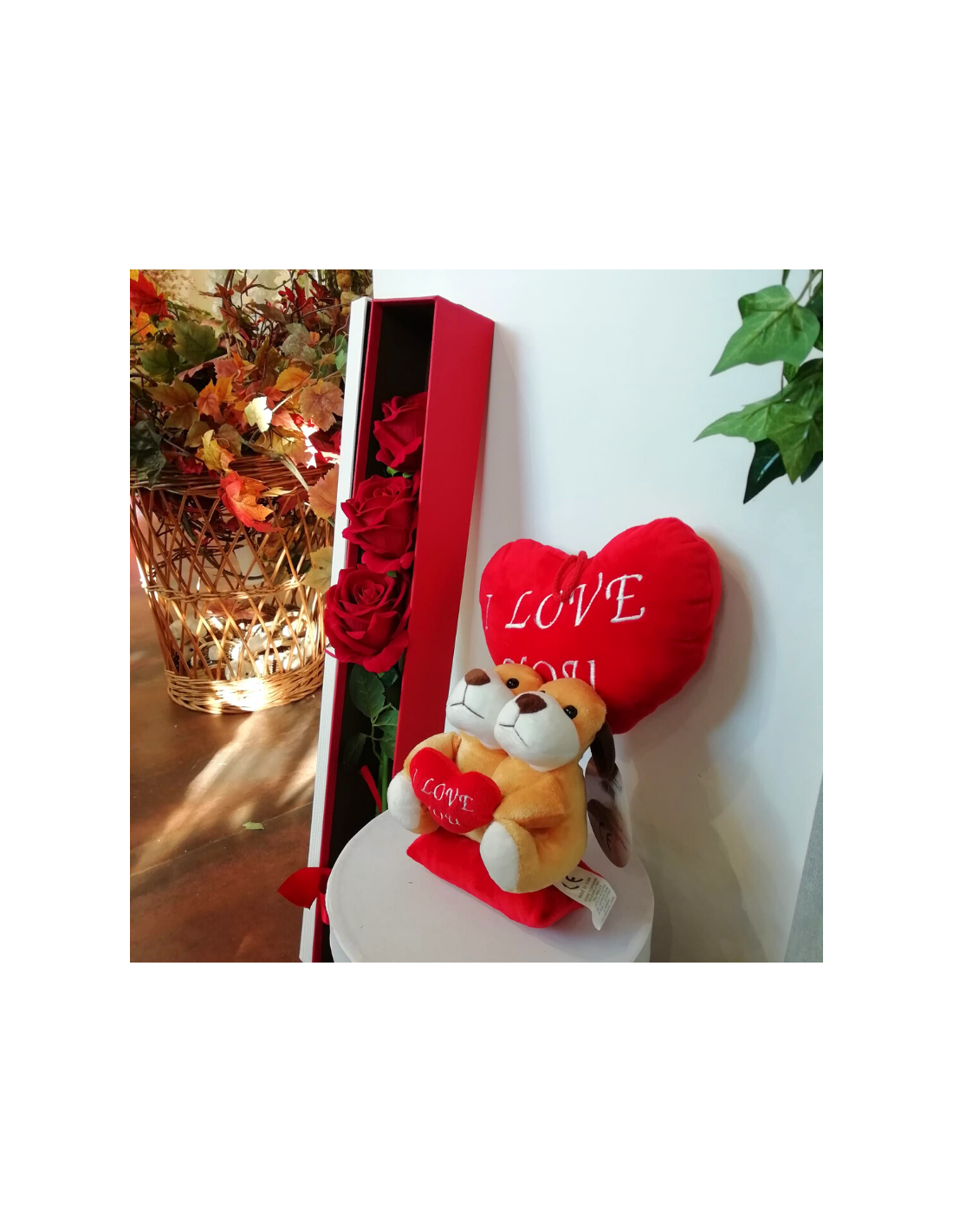 Scegli un doppio regalo e rendila felice: una scatola con 3 rose rosse vere (o in seta) e peluche da integrare. I peluche possono essere visionati al fondo tra i prodotti correlati.