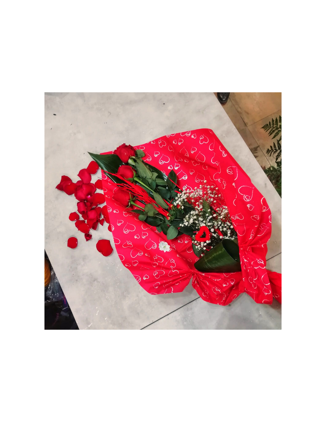Rifinito bouquet di 3 rose rosse con gambo lungo 80 cm.