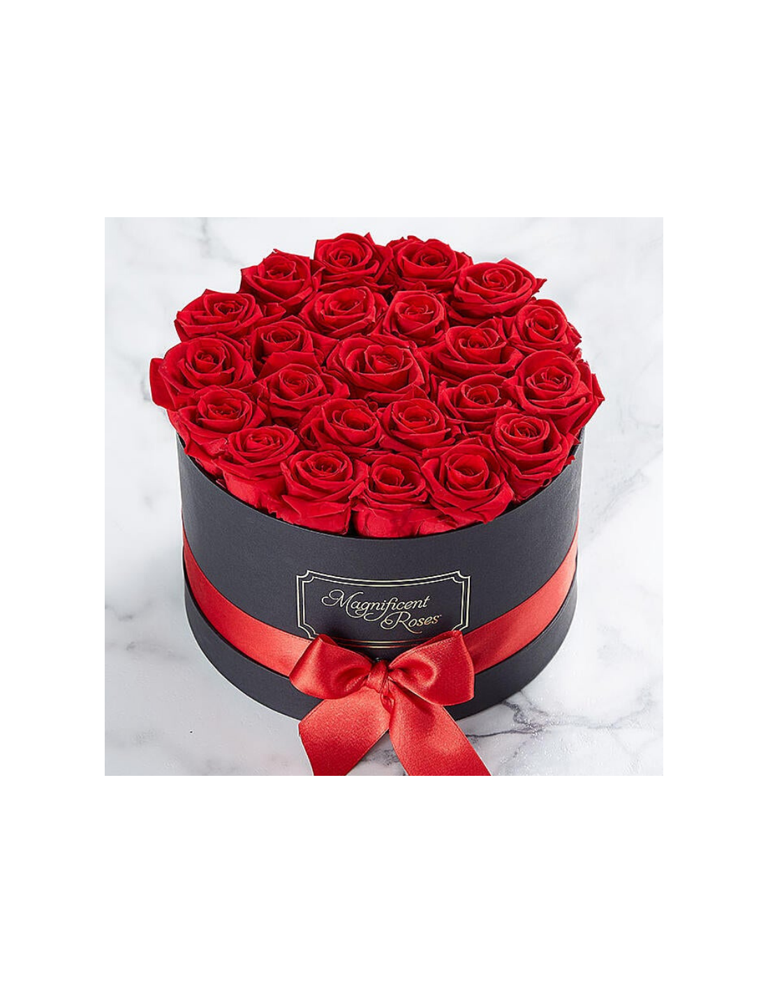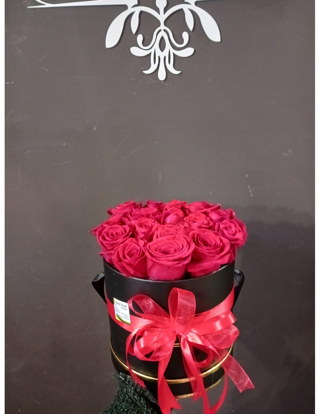 Elegante flowerbox rotonda con rose rosse da regalare a San Valentino, anniversari e compleanni.