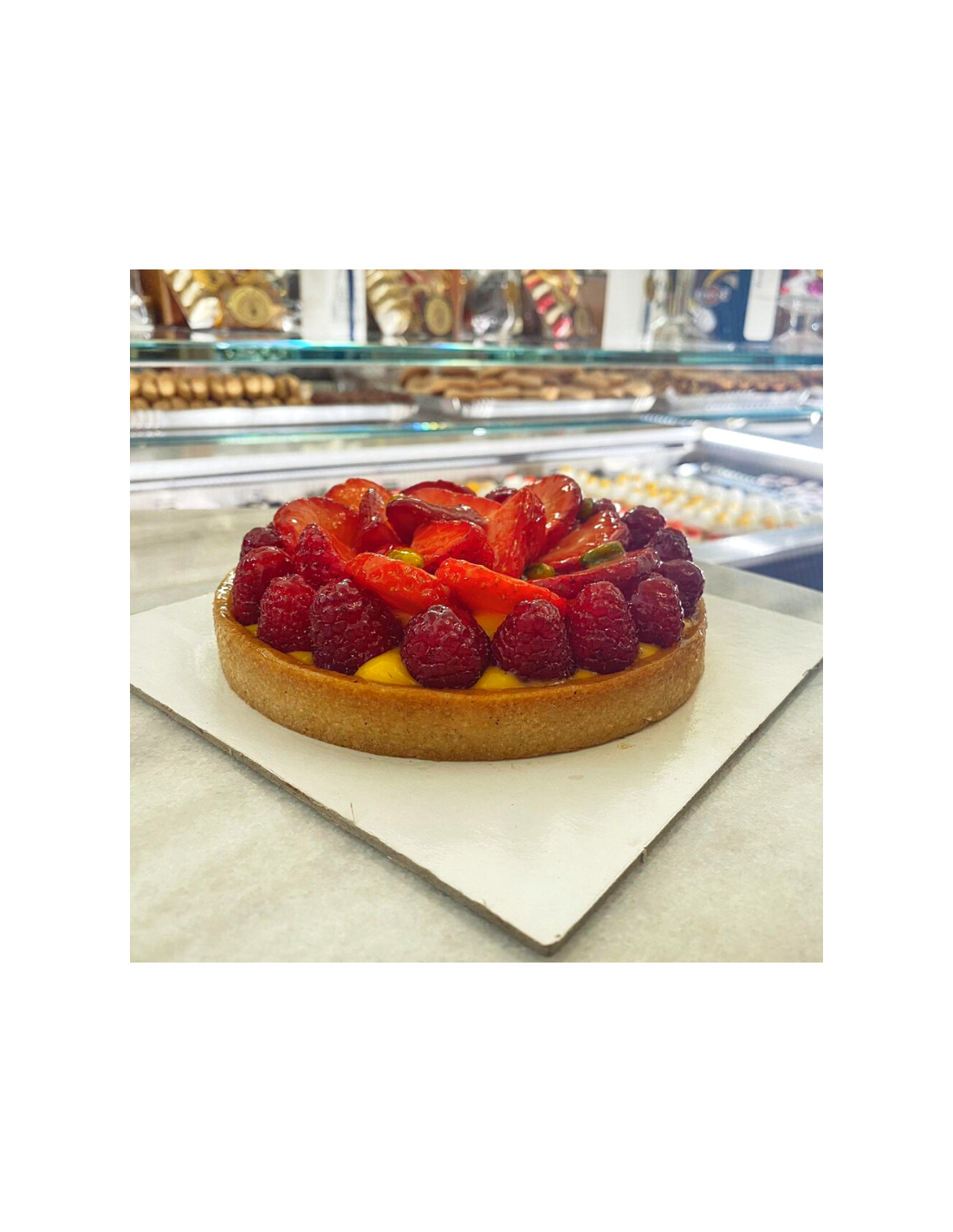 Crostata golosa con crema pasticcera e frutta fresca di stagione, un classico irrinunciabile!  Tutte le torte sono preparate sul momento da maestri pasticceri per darvi il massimo della qualità.